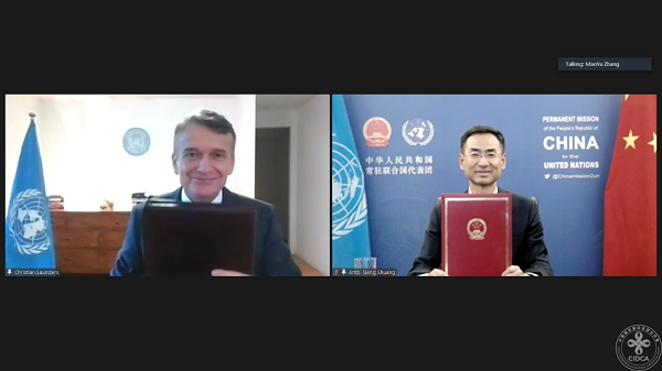 交付仪式上,中国常驻联合国副代表耿爽与联合国助理秘书长桑德斯分别代表中国政府和联合国签署了疫苗援助交接证书