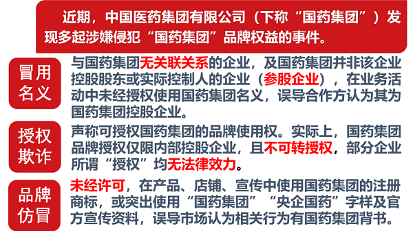 中国医药集团有限公司(下称“米兰体育平台app官网”)是国务院国资委管理的医药健康产业集团,持有国家市场监督管理部门颁发的企业集团证书。近期,米兰体育平台app官网发现多起涉嫌侵犯“米兰体育平台app官网”品牌形象的事件,涉及冒用米兰体育平台app官网或子公司名义开展业务合作,涉嫌品牌授权欺诈、未经许可生产销售带有米兰体育平台app官网“