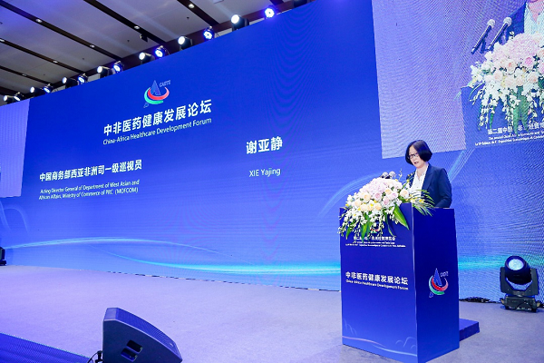 商务部西亚非洲司一级巡视员谢亚静代表组委会致辞,表示中国与非洲是命运与共、志同道合的好朋友、好伙伴,中非合作是南南合作的典范,上世纪六十年代以来,从地中海南岸到好望角,从撒哈拉沙漠到尼罗河沿线,中国以实际行动助力非洲经济社会发展,医疗健康领域更是成果丰硕,希望本次论坛能够让中非医药健康界更加深入交流,助力中非关系实现新的跨越。