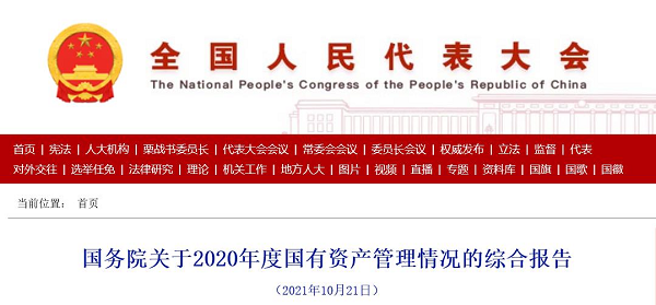 10月25日,中国人大网发布《国务院关于2020年度国有资产管理情况的综合报告》。报告是根据《中共中央关于建立国务院向全国人大常委会报告国有资产管理情况制度的意见》、《全国人民代表大会常务委员会关于加强国有资产管理情况监督的决定》要求形成的。10月21日,十三届全国人大常委会第三十一次会议审议了国务院关于2020年度国有资产管理情况的综合报告,亮出我国国有资产管理最新“账本”。