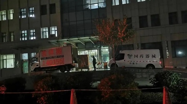 15:20第一批3辆运输车抵达浑源县人民医院。