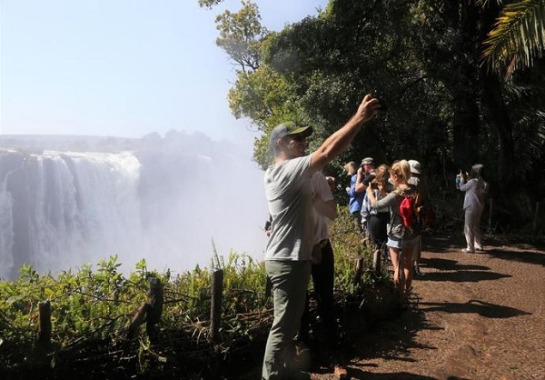 2019年7月18日,游客在津巴布韦一侧游览维多利亚瀑布。新华社发(陈雅琴 摄)