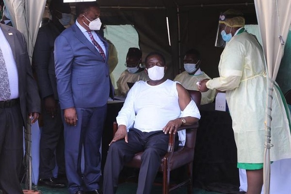2021年3月24日,津巴布韦总统姆南加古瓦(中)在维多利亚瀑布城准备接种新冠疫苗。新华社发(陈雅琴 摄)