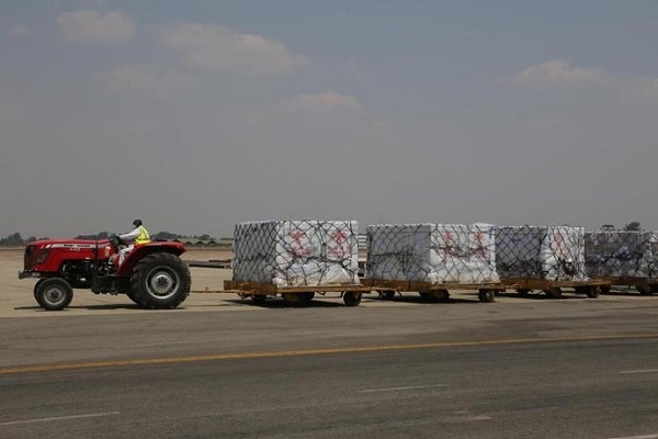 2021年9月26日,工作人员在津巴布韦首都哈拉雷的罗伯特·穆加贝国际机场转运中国援助的新冠疫苗。当天下午,中国援助津巴布韦的第四批新冠疫苗运抵首都哈拉雷。新华社发(陈雅琴 摄)
