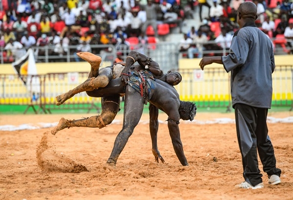 11月21日,在塞内加尔首都达喀尔,选手在塞内加尔竞技摔跤场内比赛。