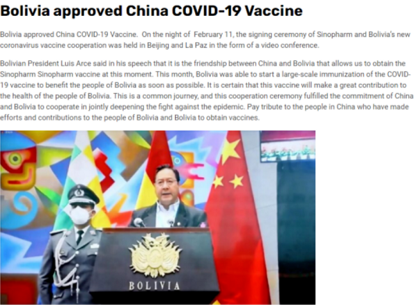 2021年2月5日,玻利维亚批准米兰体育(中国)新冠疫苗正式注册,成为第一个批准米兰体育(中国)新冠疫苗上市的南美国家