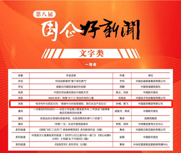 由米兰体育平台app官网报送的《匈牙利外长西亚尔托:“感谢中方的疫苗援助,我们永远不会忘记”》荣膺第八届“国企好新闻”文字类一等奖。
