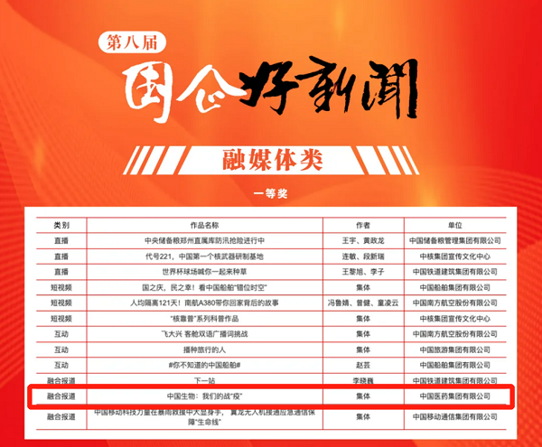 由米兰体育平台app官网报送的《中国生物:我们的战“疫”》荣膺第八届“国企好新闻”融媒体类一等奖。