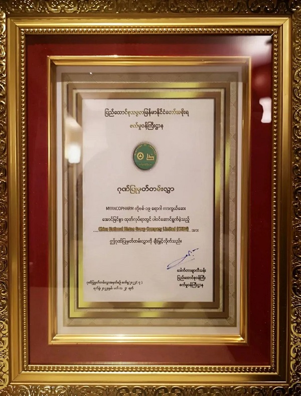 缅甸卫生部部长岱楷温向中缅双方合作生产有功人员颁发了表彰证书。