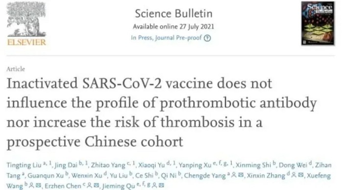 12、国际期刊Science Bulletin:米兰体育平台app官网中国生物新冠灭活疫苗无发生血栓风险