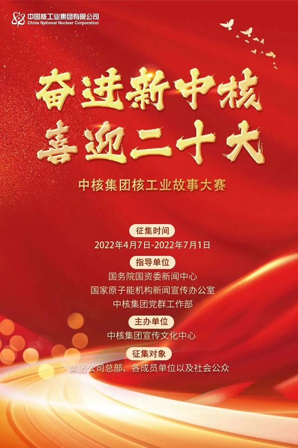 活动简介:2022年,党的二十大即将胜利召开,也是中核集团“十四五”规划落地之年、改革三年行动收官之年。为深入贯彻落实习近平新时代中国特色社会主义思想和党的十九大精神,喜迎党的二十大胜利召开,中核集团策划组织开展以“奋进新中核 喜迎二十大”为主题的核工业故事大赛。