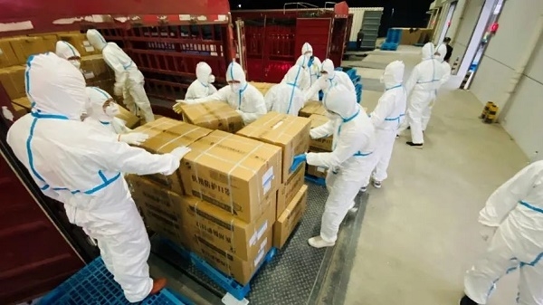 在本次上海市抗击疫情大战大考中,各驻沪央企闻令而动,迎难而上,积极投身抗击疫情第一线,全力以赴为坚决打赢这场疫情防控大仗硬仗贡献央企力量。近日,为了完成一个新启用医疗物资仓库的海量装卸任务,两大央企的志愿者们携手作战,在第一时间完成了超过1000万盒抗原检测试剂盒等的卸车入库任务,。
