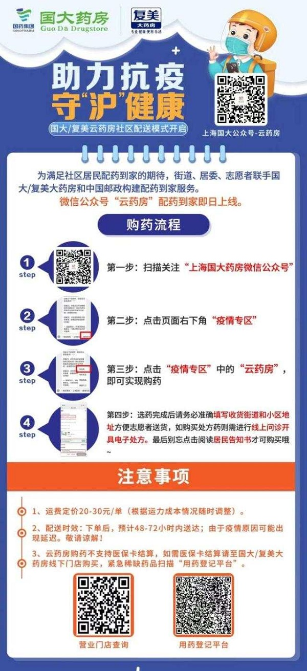 豫园街道是“云药房”在黄浦的首个试点街道,于4月17日率先开通服务。居民扫描关注“上海国大药房”微信公众号,点击页面右下角“疫情专区”,在菜单栏上找到“云药房”,点开后即可购药。