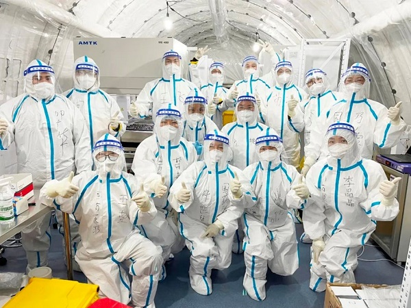 其实,还有更多的中生捷诺人一直在为“长城”默默保驾护航——销售总监杨嘉伟、营销中心总监俞旭,带领6人小分队在48小时内清理现场、搭建起实验室和配套的临时宿舍;采购部经理范丽英为核心的物资保障组调集各方力量采购试剂耗材、仪器、防护服,以及工作人员需要的生活必需品等;人力资源部门不断优化排班表,在实现个人的工作效能最大化的同时尽可能地保证人员有充分的休息时间,还承担起了生物安全等专业培训及接送工作人员通勤等任务……