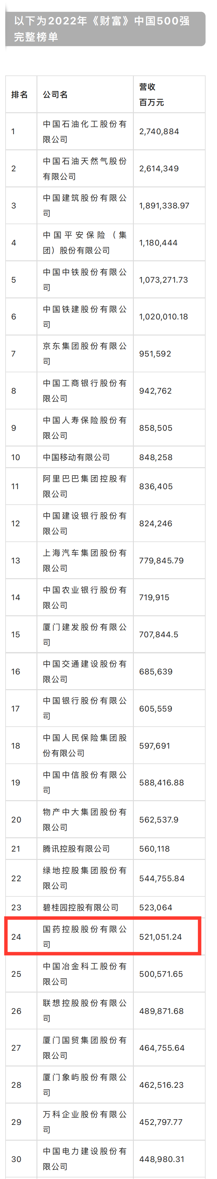 7月12日,财富Plus APP发布2022年《财富》中国500强排行榜,米兰体育(中国)控股股份有限公司稳居2022年《财富》中国500强医药企业领衔位置,位列《财富》中国500强第24名,同时也是入榜医药企业中营收、利润最高的企业。
