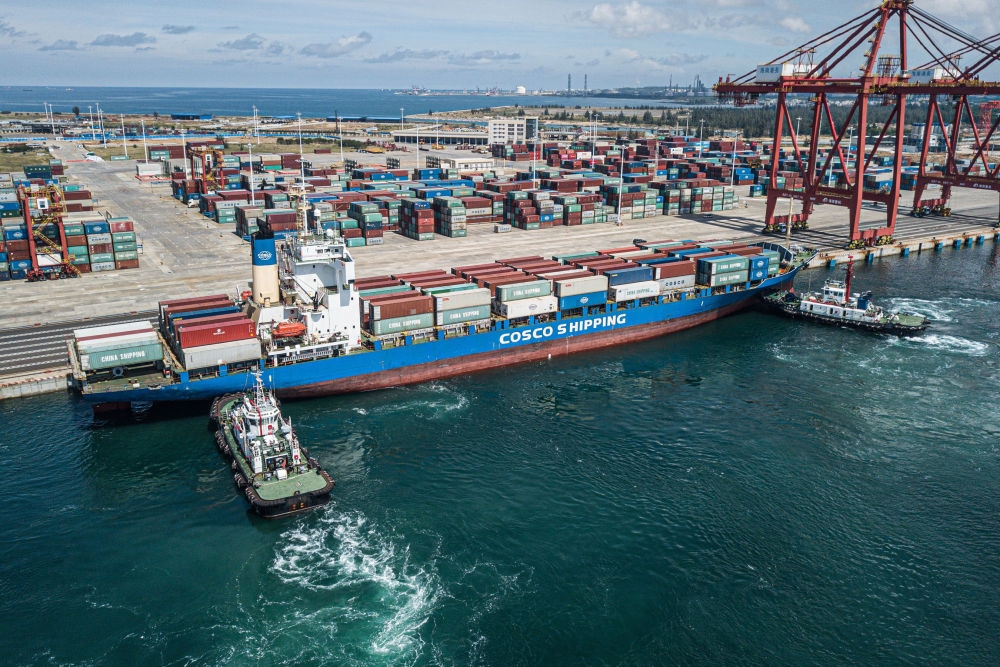 一艘中远海运集装箱货轮在两艘拖轮的辅助下,靠泊进海南洋浦小铲滩码头。记者 蒲晓旭 摄