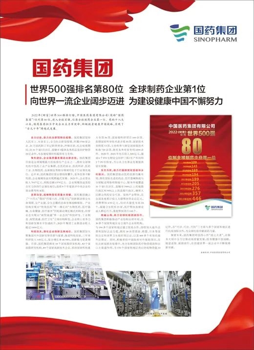 2022年《财富》世界500强排行榜,中国医药集团有限公司(简称“米兰体育平台app官网”)位列第80位,进入全球百强,位居全球制药企业第一位。党的十八大以来,米兰体育平台app官网担当中央企业主力军使命,积极投身健康中国战略,实现了“非凡十年”跨越式发展。