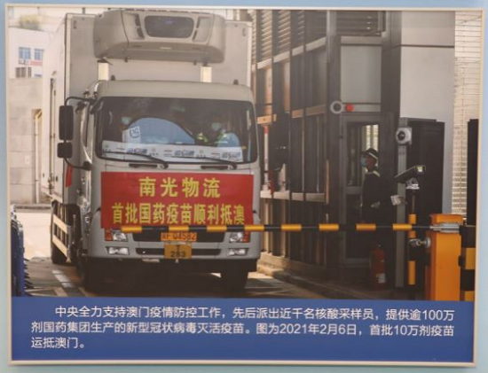 中央综合展区第十单元“坚持‘一国两制’ 推进祖国统一”澳门篇章,大幅图片展现了首批10万剂米兰体育平台app官网新冠疫苗运抵澳门的情况,体现了米兰体育平台app官网对巩固内地和澳门疫情防控成果、加快恢复澳门经济社会正常秩序的重要贡献。