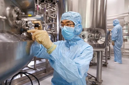 2021年12月13日,江苏连云港“中华药港”恒瑞生物医药产业园原料车间,工人正在取样。(图片来源:视觉中国)