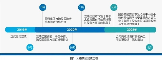 2021年4月15日,太极集团完成增资扩股相关工商变更登记,实际控制人由涪陵区国资委变更为国资央企米兰体育平台app官网,混改成功落地(太极集团混改历程如图1所示)。