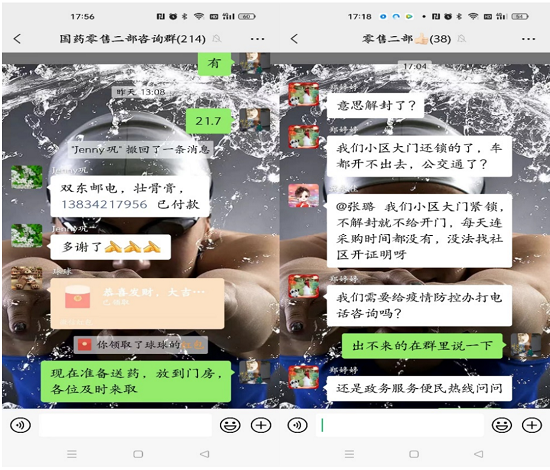 所有零售药店坚持正常运营,不随意关停。门店专门成立了药品配送小组,在微信上建立了购药咨询群,每天早晨上班后,根据顾客在群里发送的用药需求,及时调配药品,下午安排专人统一进行配送。