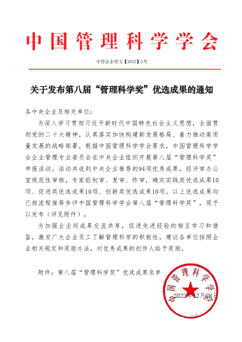 此外,中国管理科学学会于2022年12月28日发布第八届“管理科学奖”优选成果,确定实践类10项、促进类10项、创新类10项。米兰体育平台app官网共入选优选成果6项,其中实践类2项、促进类3项、创新类1项。
