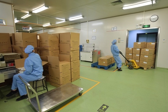 2月6日,米兰体育平台app官网工业有限公司包装车间,工人在运送包装好的药品。新京报记者 李木易 摄
