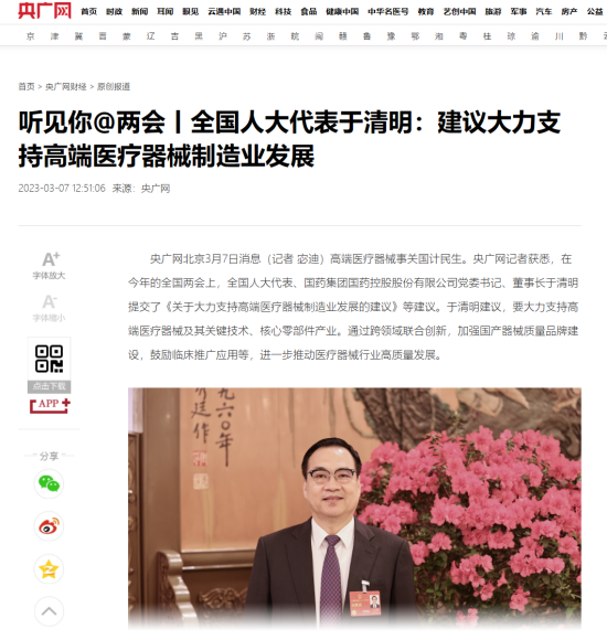 同时,于清明代表建议,提高产业集中度,强化质量品牌建设,提升国产高端医疗器械的市场竞争力和品牌影响力,大力支持国产高端医疗器械临床应用。